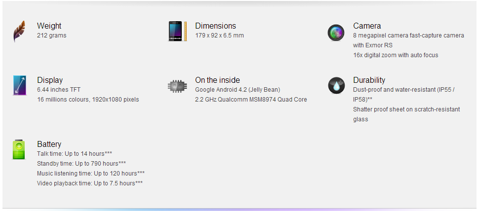 Az előzetes hírek igaznak bizonyultak, hiszen az Ultra a Qualcomm idei legerősebb mobil SoC-ját, a Snapdragon 800-at (2,2 GHz) kapta. Ez jóval erősebb a mostani zászlóshajókban lévő Snapdragon 600-nál, ráadásul az ehhez tartozó Adreno 330-as GPU kb. 50%-kal jobb teljesítményre képes, mint az elődeje (320). A 6,4 colos óriás természetesen 1080p kijelzővel rendelkezik, melynek különlegességét a Triluminos panel és az X-Reality motor adja, melyeknek köszönhetően is kristálytiszta és gyönyörű képet kapunk. Ezek mellé párosul a 2 GB memória, a 16 GB-os háttértár (microSD-vel bővíthető), a 8 és 2 MP-es kamera és az Android 4.2.2 Jelly Bean.