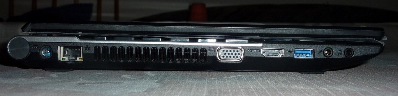 Bal oldalon töltőcsatlakozó, Ethernet csatlakozó, méretes hűtőnyílás, D-Sub kimenet, HDMI port, USB3.0, mikrofon és fülhallgató bemenet várja a bevetést.