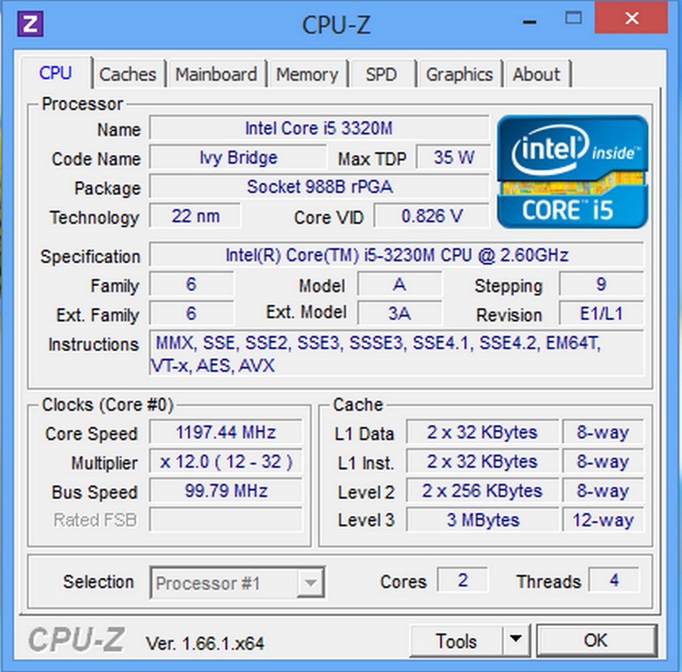 A processzor egy elég erős Intel Core i5-ös példány az Ivy Bridge szériából, 2.6 GHz-es órajelekkel, 1 magon 3.2 GHz-es maximális Turbo Boost órajellel, 2 magon ez 3 GHz-re mérséklődik, és HT támogatással. 35Wattos TDP osztályban versenyez, ami nem kevés, cserébe valóban nagyon gyors a gép.