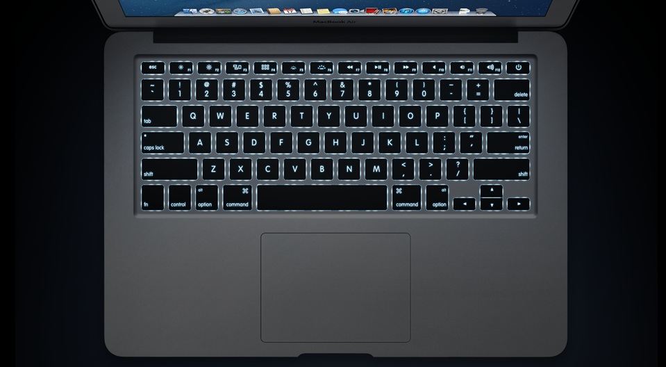 Elképesztően kompakt kialakítása ellenére a MacBook Air billentyűzete teljes méretű, így a gépelés egyszerre természetes és kényelmes. Ráadásul a billentyűzet saját háttérvilágítással bír, így a leggyengébb fényviszonyok mellett is könnyedén gépelhetsz. A beépített fényérzékelő észleli a fényviszonyokban beállt változást, és ahhoz igazítja a kijelző és a billentyűzet fényerejét. Legyen az egy napsütötte kávéházi terasz vagy egy éjszakai repülőjárat, laptopod fényereje minden környezethez tökéletesen alkalmazkodik.