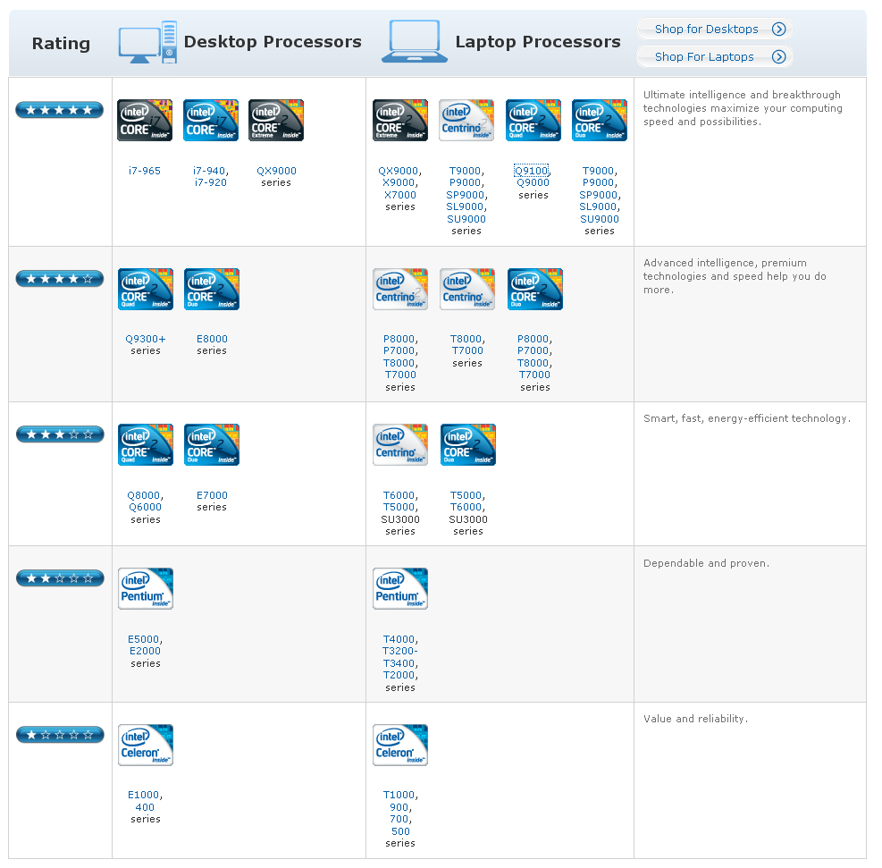 Ezen a számkavalkádon igyekezett az Intel változtatni azzal, hogy bevezette az új megjelölést, a csillagozást. Mostantól 1-5 csillaggal jelölik a processzorokat, melynek rendező elve a teljesítmény és ár. Azaz a leggyengébb, belépő szintű processzor 1 csillagot kap, míg az extrém felhasználói igényeket is tökéletesen kielégítő CPU 5 csillaggal büszkélkedhet. A belépő szintű – azaz az 1-2 csillaggal rendelkezőek – processzorok is tökéletesen kielégítik egy átlagos otthoni felhasználó napi szükségleteit (internet, mozi, fényképek, e-mail, Skype). Ha ennél egy picivel többre vágyunk, jó döntés a középső szegmensből választani. Ez a kategória remek balansz a erő, a teljesítmény valamint az energiatakarékosság között. Árban is még viszonylag elfogadhatóak, de a bennük rejlő erőt kevesen fogják majd kihasználni. A 4 csillagos modellek már erősen a felső kategória tartozékai: ezek a komoly üzleti modellekbe illetve a játékokra tervezett noteszgépekbe kerülnek beszerelésre. Itt már komoly a teljesítmény, ezen laptopoknak nem okoz különösebb gondot egy avi/mpeg konvertálás, egy tervezőprogram számítási feladatai, illetve egy komoly videokártya CPU-s támogatása. A high-end-et az 5. csillag jelenti, kis hazánkban a normál földi halandó soha nem fog ilyen processzorral szerelt gépet vásárolni. Ezen processzorokra vagy a döbbenetes számítási sebesség, vagy a hihetetlenül alacsony fogyasztás jellemző. Ilyet az átal user kár is hogy nézegessen, hisz soha nem fogja kihasználni a masina képességeit.
