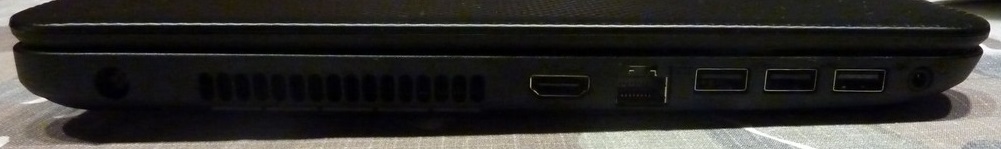 Bal oldalon a töltőcsatlakozó, szellőzőnyílás, 2db 3.0-s USB és 1db 2.0-s USB port mellé jutott egy kombinált fejhallgató kimenet-bemenet.