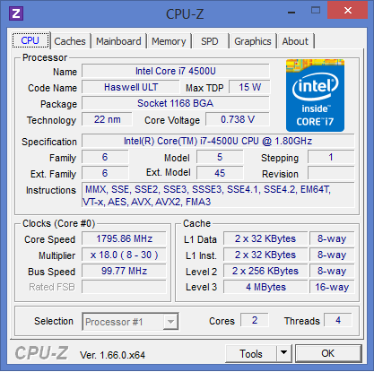 Jelen esetben egy i7-es processzort kapunk szintén a Haswell családból 4500U jelzéssel. A 4 szálon is dolgozni képes, 2 magos feldolgozó 1.8GHz-es alap órajelekkel rendelkezik, ami 2 aktív magon 2.7 GHz-es maximális turbo órajelre képes. 1 magos használat esetén ez 3.0GHz-re növekszik. A TDP osztály továbbra is 15W mindösszesen.