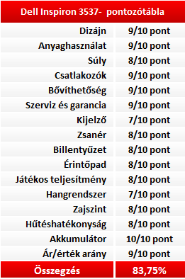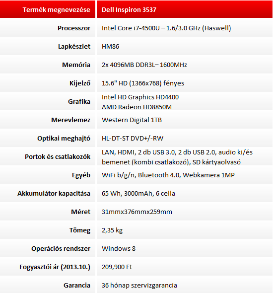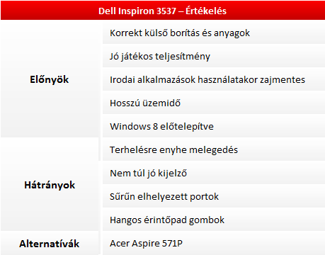 Egy teljesen korrekt borításhoz jár egy elég erős processzor és grafikus egység, valamint egy remekül használható előtelepített Windows 8. Ezt kínálja a Dell jelenleg a 3537-es noteszgép csúcsváltozatával. Akit megragad a külső, illetve szüksége van a hosszú üzemidő mégis relatíve erős hardver kombinációjára annak minden bizonnyal az egyik legjobb vétel lesz ez a noteszgép.