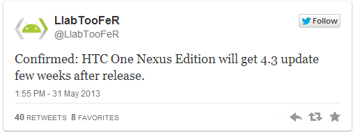 A tegnapi napon bejelentették a HTC One GE értékesítésének kezdetét. Ez a dátum június 26-a lesz. Mai Twitter bejegyzés szerint a tulajok nem sokáig fogják élvezni az Android 4.2.2 Nexus élményét a One-on, mivel pár héttel a megjelenése után érkezhet hozzá az Android 4.3-as frissítés. Ez kettős öröm lehet, mivel egyrészt újabb AOSP romot futtató eszközt kapunk, másfelől hamarosan jön a következő szoftverfrissítés. Forrás: http://goo.gl/RBL4y