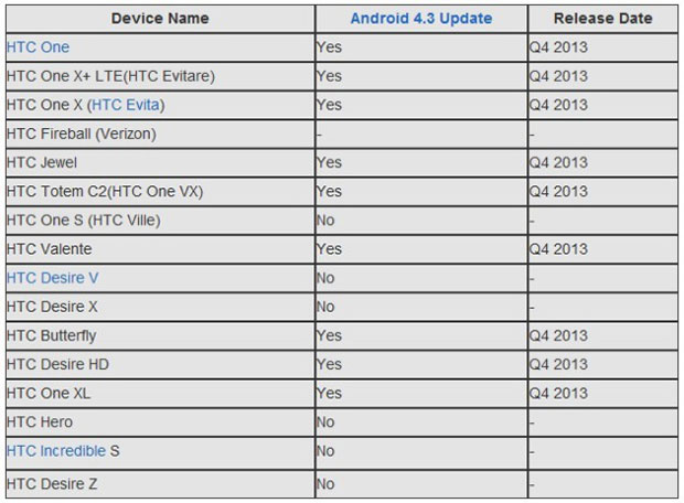 Habár még hivatalosan be sem jelentették az Android 4.3 létét és érkezési idejét, a log fájlok és a kiszivárgott adatok alapján arra lehet következtetni, hogy ez el a következő Android verzió. Ennek fényében a HTC létrehozta saját listáját, hogy mely modelljeik kapják meg a frissítést. Szerencsénkre kiszivárgott az állítólagos terv, melyben semmi meglepő nincs. A régebbi középkategóriájú mobilok esnek el a jogtól, de az elmúlt 1-2 két év komolyabb HTC-i természetesen számíthatnak az újdonságra: Forrás: http://goo.gl/Q07qU
