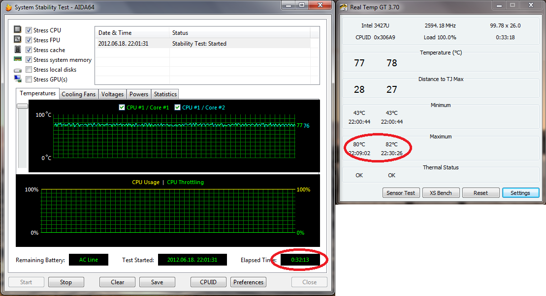 Mielőtt elkezdeném ecsetelni a zaj és hőmérsékleti adatokat fontos megemlíteni, hogy a teszt elkészülése alatt erős kánikula volt, a tesztkörnyezet pedig egy klíma nélküli panellakás, mely a 30°C-os szobahőmérsékletével közel trópusi hangulatokat idézett elő. A meleg panellakás és a notebook vékony kivitelezése miatt én úgy gondolom, hogy az alap 49°C-os CPU hőmérséklet egész jó eredmény, melyhez nagyon halk 5dB-es zajszint párosult.