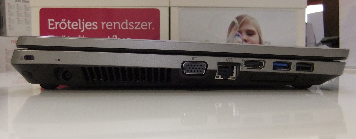 Bal oldal: kensington zár, töltő csatlakozó, hő kivezető nyílás, d-sub, lan, hdmi, 1x usb 3.0, 1x usb 2.0, pcimcia express card