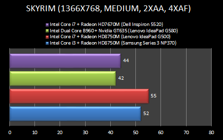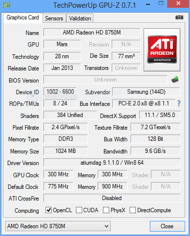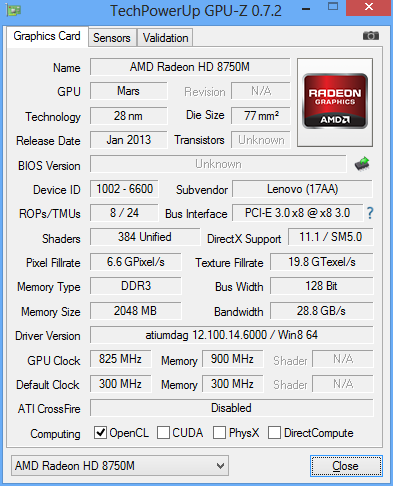 A játékok tesztelése során jól látható, hogy az IdeaPad G500 jobban teljesített mint a Samsung Series 3 NP370. A laikus olvasó erre nyilván azt mondaná, hogy ez biztos a processzor miatt van. Hát nem! Már ugye korábban bebizonyítottuk, hogy a Radeon HD8750M és az ahhoz hasonló teljesítményű grafikus vezérlők játékos teljesítménye nem a processzortól függ. A magyarázat ennél sokkal egyszerűbb, mégpedig, hogy az IdeaPad G500-ban szimplán erősebb (emelt órajelű) AMD Radeon HD8750M került, melyet mi sem bizonyít jobban mint a GPU-z nevezetű tesztprogram.