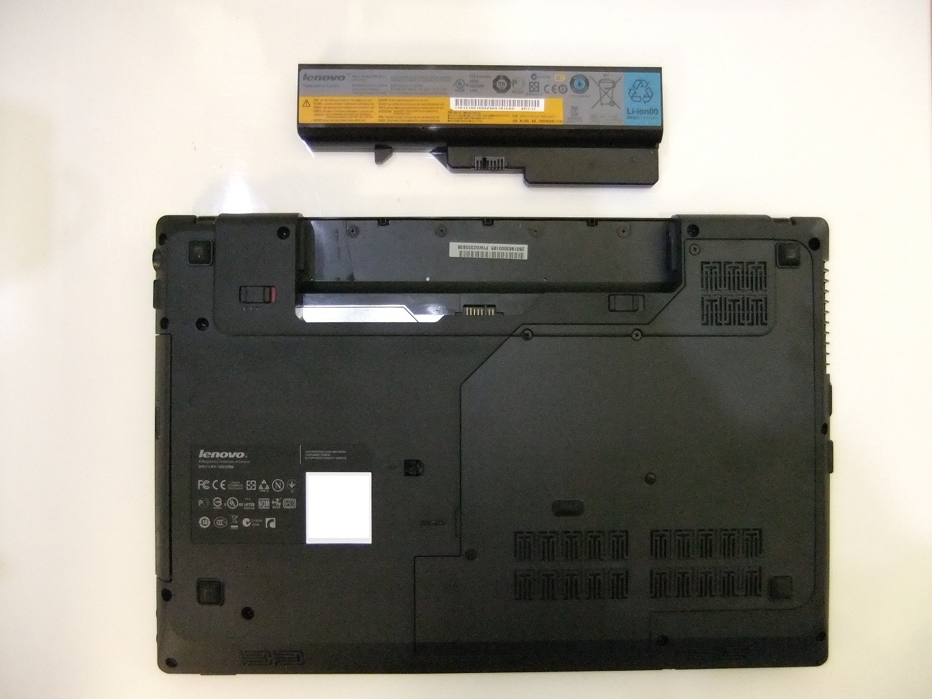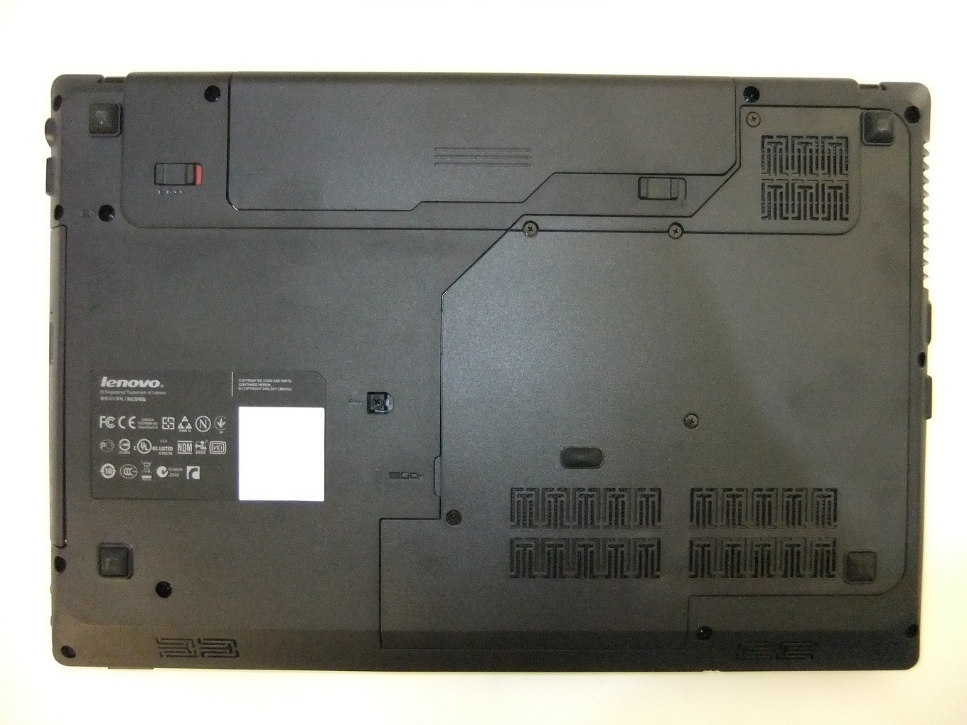Alulról: akkumulátor és annak nyitógombjai, szellőzőnyílások, memória és merevlemez takarófedele