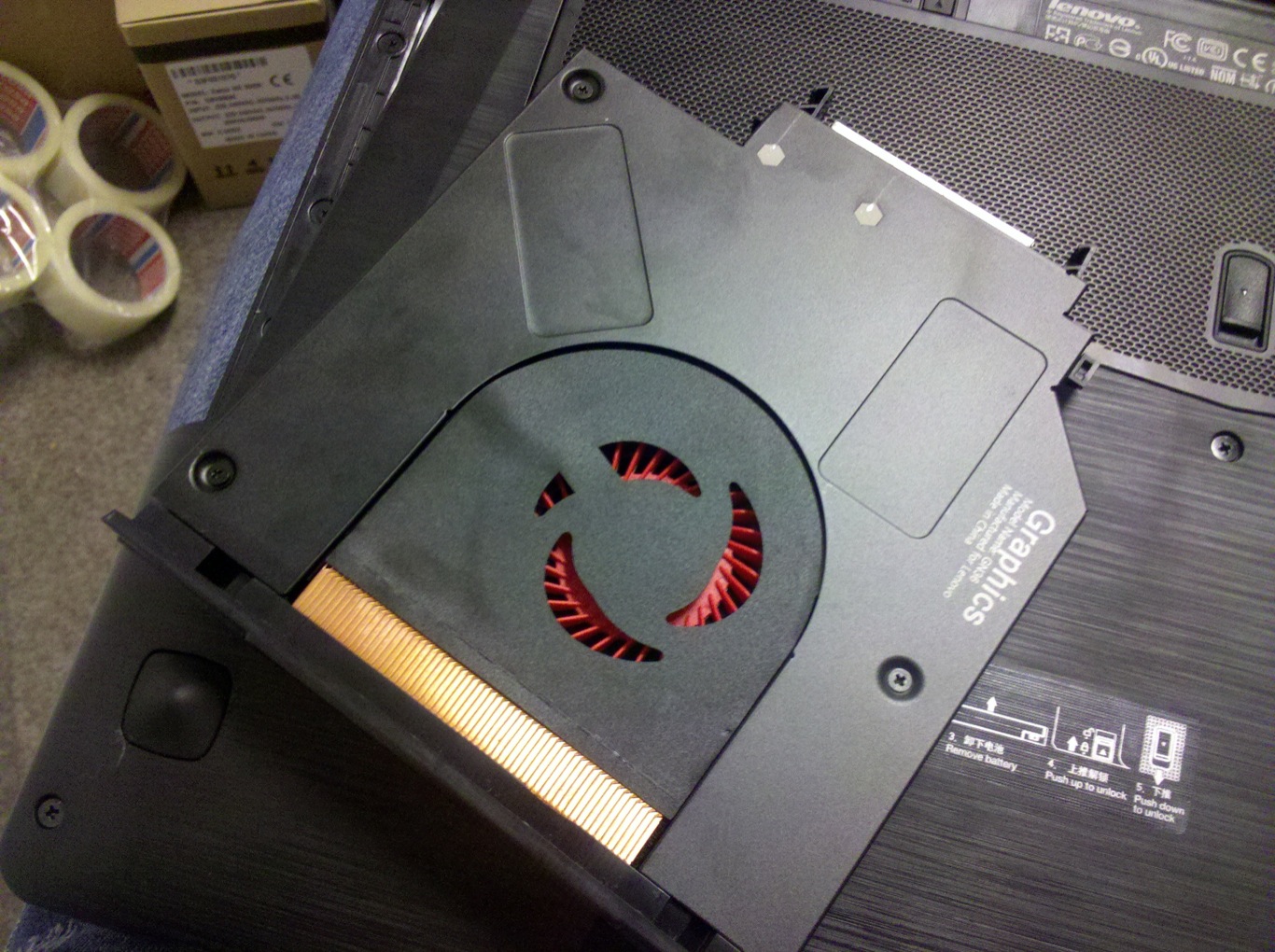 A jobb oldalon van egy Kensington zár, mely a gép biztonságos rögzítését hivatott elősegíteni. Mellette van még 1db 2.0-ás USB csatlakozó, mely Sleep&Charge funkciót is el tud látni, valamint mellette van 2db jack aljzat külső headset-hez valamint mikrofonhoz. A gép moduláris felépítéséből adódóan, valamint az opcionális SLI funkció miatt, az optikai meghajtó helyére helyezhetjük a másodlagos VGA-t, amely egy GT 650M Nvidia kártya (az elsődleges is ez  ) Az UltraBay eszköz kivétele első körben többünknek problémát okozott, mivel látszólag a gép alján lévő “nagy pöcök” segítségével könnyedén kiemelhetjük az aktív hűtéssel rendelkező kártyát, ám ekkor jött a nagy koppanás, mert az meg sem mozdult. A Lenovo mérnökei az akksi alatt elrejtettek egy kisebb másodlagos zárat. Ennek oldásával már sikerült megoldanunk a problémát és lencsevégre kapni az Nvidia VGA-t.