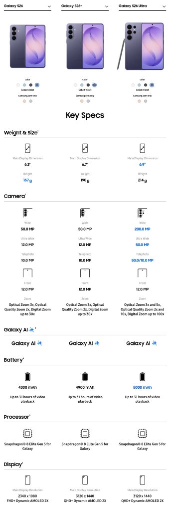 A Galaxy S26 széria előrendelése február 25-én indul. Egységes dizájnnyelv jellemzi minden modellt, az elérhető színek között szerepel a Cobalt Violet, White, Black és Sky Blue, valamint online exkluzív Pink Gold és Silver Shadow.