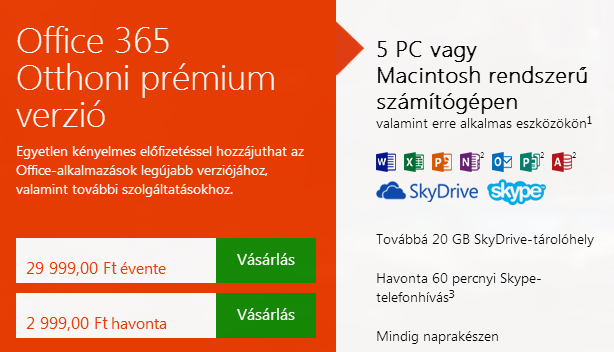 Úgy tűnik ezen a téren is egyre inkább bíznak a készítők az egyszeri fizetés helyett a havidíjban. Viszont ezzel párhuzamban joggal merül fel a kérdés, mi szükség lenne havidíjas Office-ra? Egyelőre a válasz nem olyan könnyen megfogható, főleg nem hazánkban. Az előfizetéses verzió (a „régi vágásúak” az új Office 2013 árát is leperkálhatják egy összegben) immáron egy szolgáltatás-csomagot is magába foglal, nem csak különböző módon tálalt teleírható felületeket.