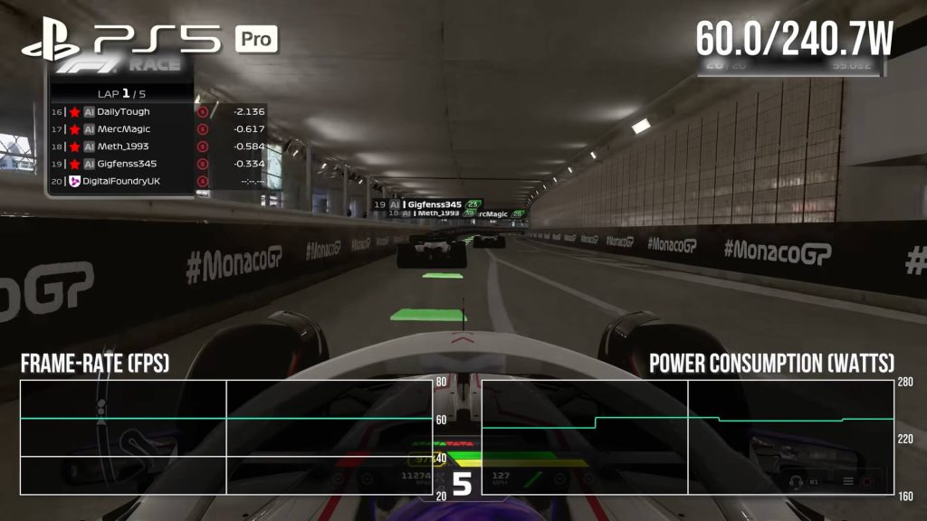 Utolsóként az F1 24-ben mérték össze a termékeket. Itt a PS5 Pro fogyasztása 230 W felett mozgott, maximuma 240 W volt “Quality” módban.