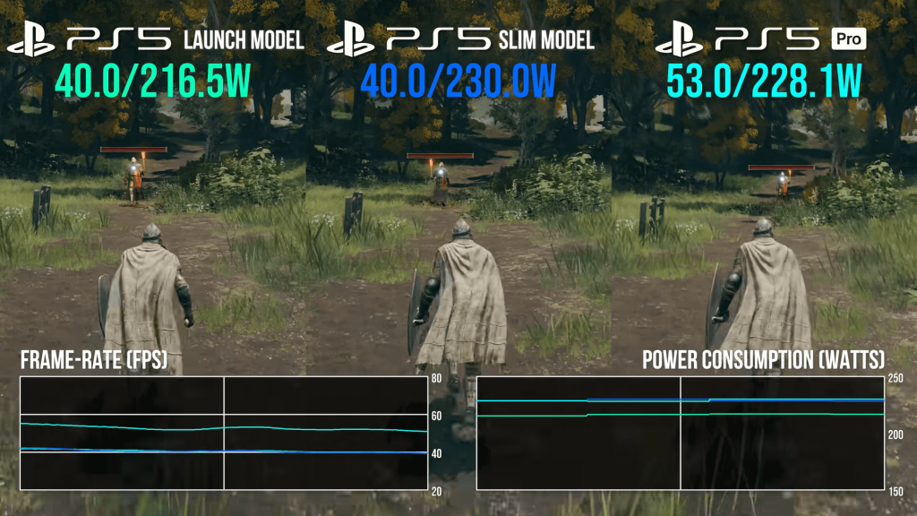 Szebb kép, jobb Ray Tracing és több/stabilabb FPS szám – ezt nyújtja a PS5 Pro korábbi (alap) testvéréhez képest. Elden Ring alatt 30-35%-os teljesítménynövekedés is tapasztalható „Quality” módban, annak ellenére, hogy a játékot nem optimalizálták külön e konzolra. Ez azt eredményezi, hogy a képkockasebesség folyamatosan 50 FPS felett marad. Ezzel szemben az alap PS5 hajlamos 40 de akár 30 FPS alá is beesni.