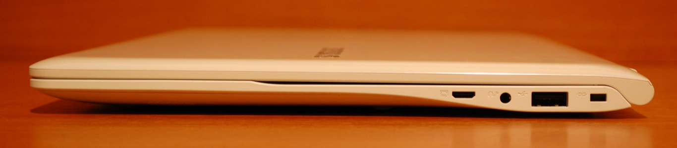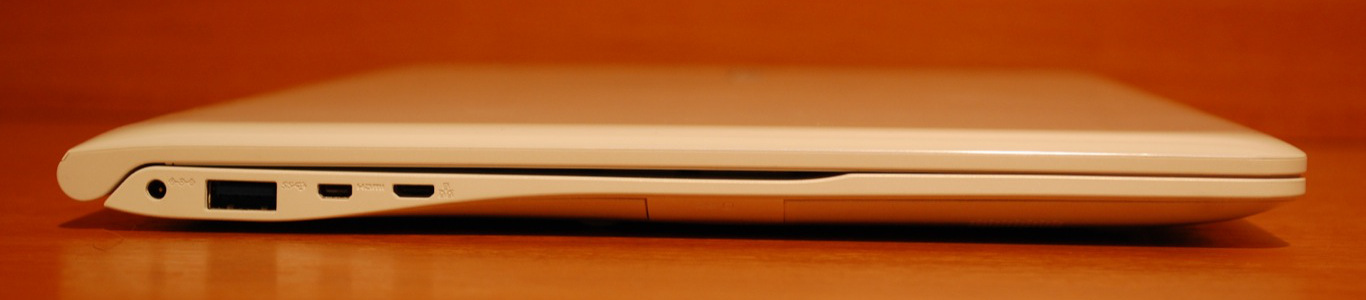 Baloldal: töltő csatlakozó, 1 db USB 3.0, mely töltő funkcióval is rendelkezik (kikapcsolt állapotban is tudja tölteni USB-s eszközünket), mini HDMI és LAN csatlakozó, utóbbihoz a csomag tartalmaz egy átalakítót is.