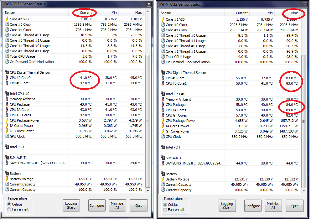 A Processzor alapjáraton igen kellemes 40°C környékén mozogott és mindehhez szinte néma zajszint párosult. Csak néha-néha kapcsolt be a hűtőventilátor, de az is csupán 10-11db zajszintet produkált. A játéktesztek futtatása közben viszont már sikerült megizzasztanunk a CPU-GPU párost, melyek hasonló 83-84°C-ot produkáltak, a zajszint pedig 21db-re növekedett, ami például a Lenovo IdeaPad Y570 zajszintjével megegyező és szerintem teljesen elfogadható.