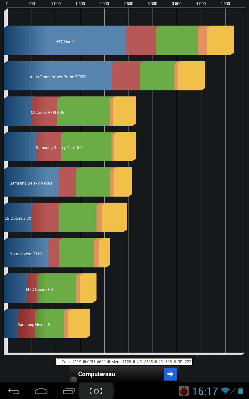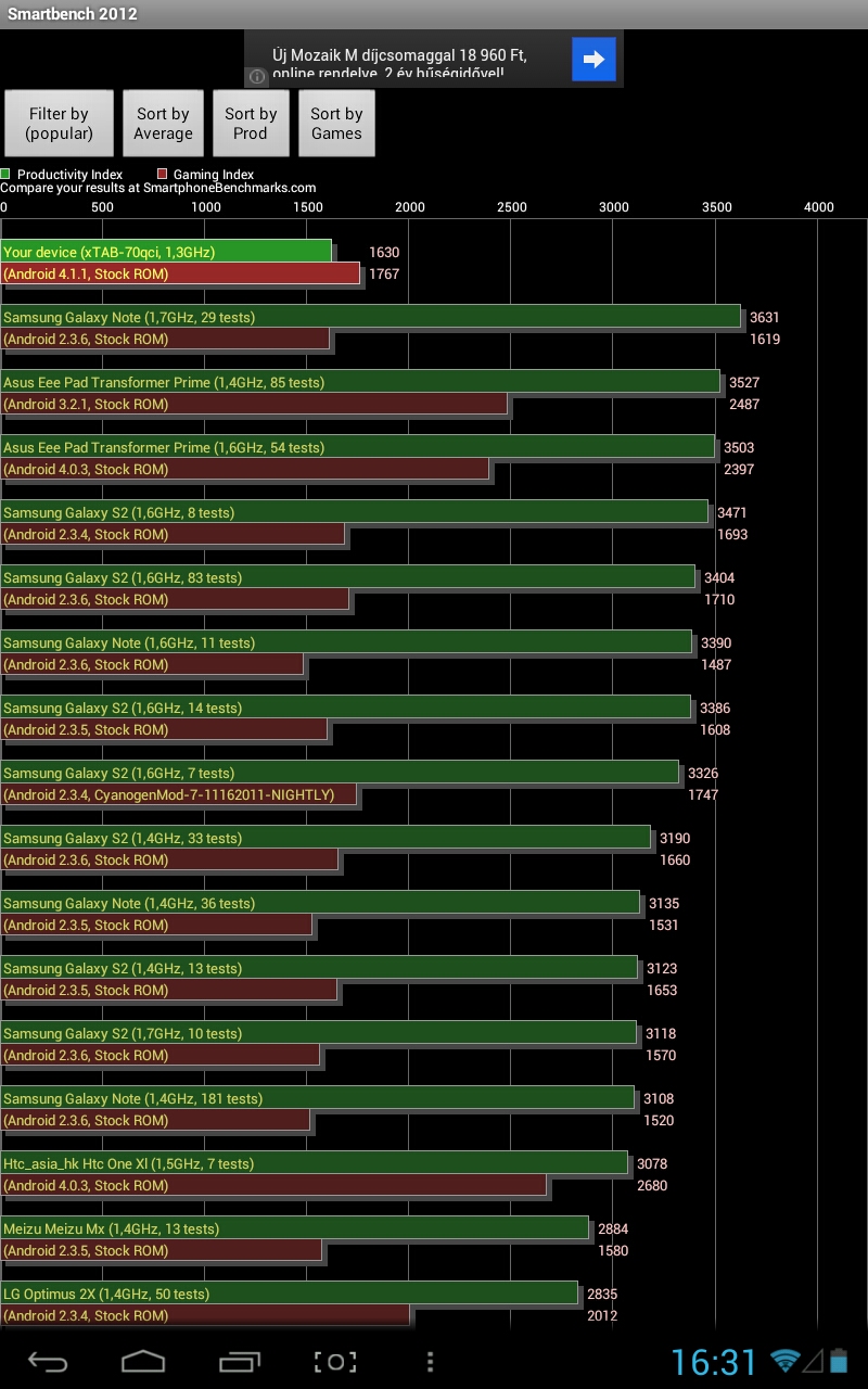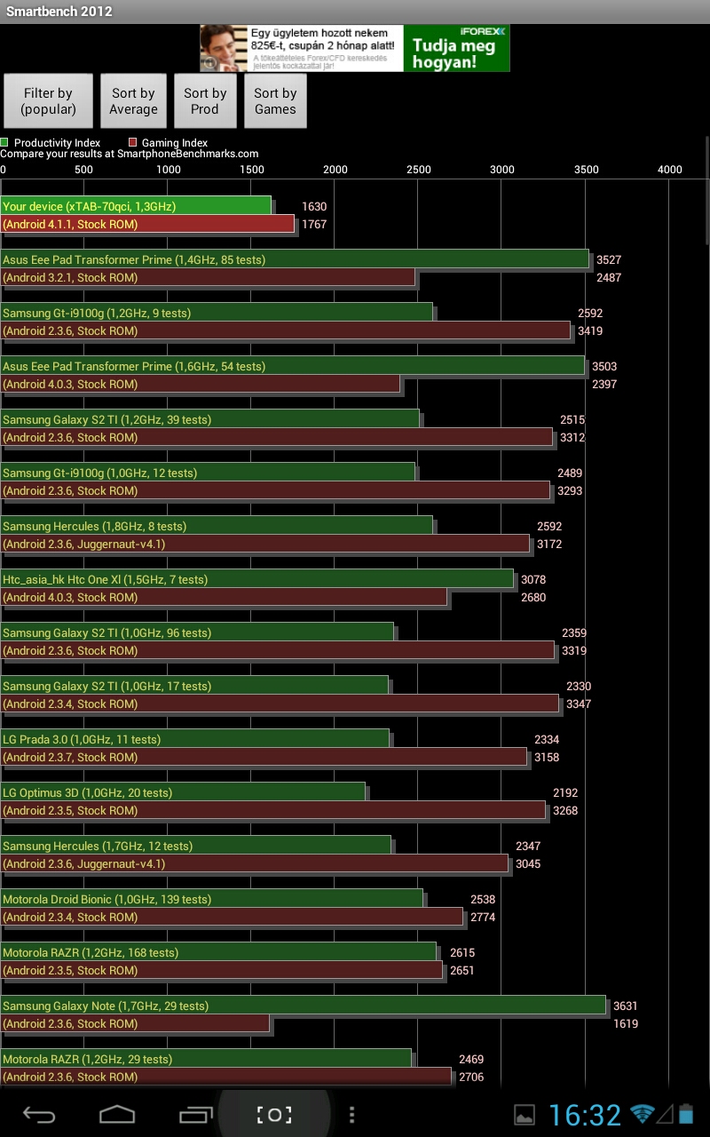 De mi is hajtja az xTAB-70QCI-t? Egy négymagos, magonként 1,5 GHz-en ketyegő ATM7029-es chip, ami Cortex-A9-es magokat tartalmaz. Ehhez párosul a Vivante GC1000-es GPU valamint az 1GB memória. A Quad Core jól hangzik, azonban ez a SoC sokkal inkább van versenyben a kétmagos megoldásokkal, de ott is vannak erősebbek, amelyek túlnőnek az ATM chip-en (Pl.:Rockchip 3066). Emiatt, sajnos játékokban sem a legerősebb, régebbieknél is tapasztaltunk laggolásokat. A rövid tesztidőszak alatt nem próbáltunk ki irdatlan mennyiségű applikációt, de több nem volt hajlandó elindulni semmi úton módon. Ilyen volt például az AnTuTu, amely teszteredménye így hiányzik is a listából. Most lássuk a szintetikus eredményeket.