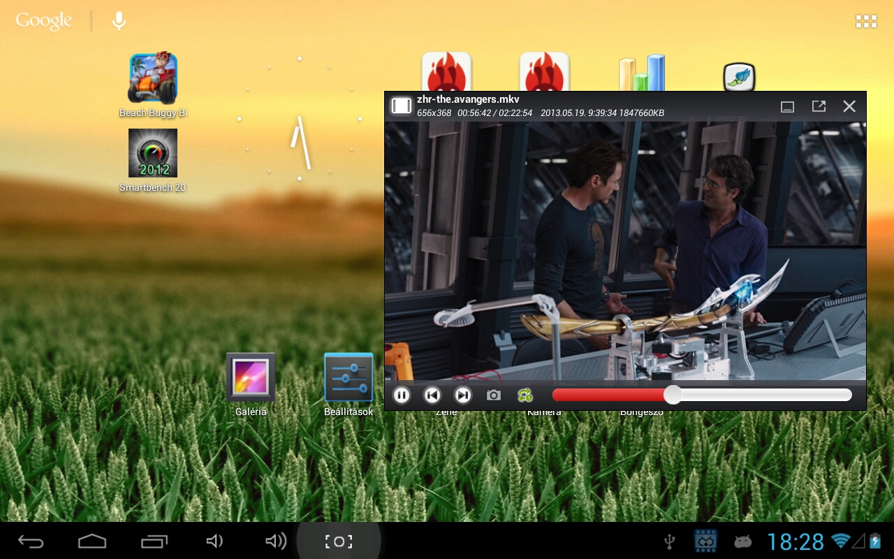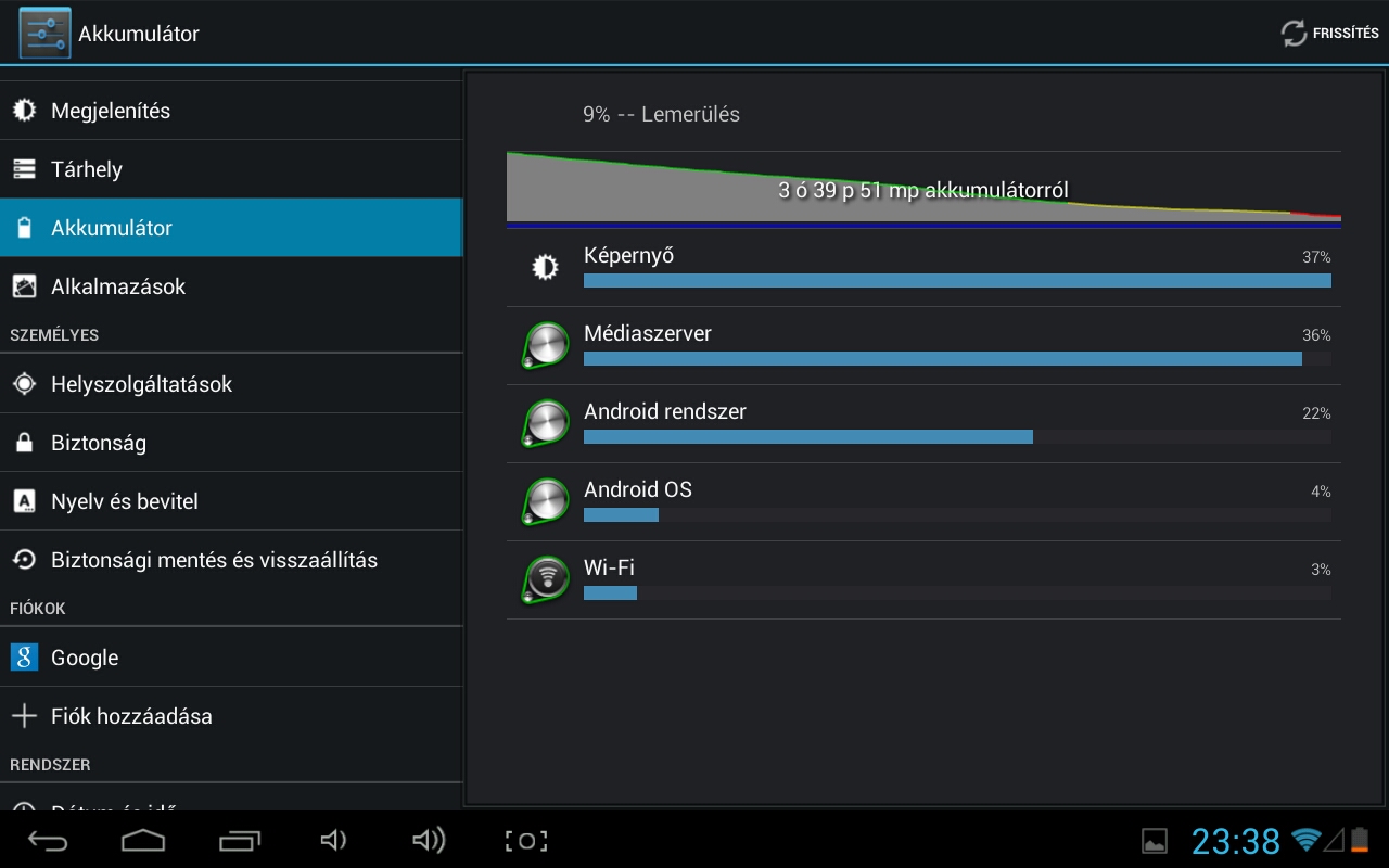 Kritikus részhez érkeztünk, hiszen a tabletek még mindig sokaknak csak alternatív, áthidaló megoldást nyújtanak például egy hosszú utazás során. A kis, kompakt méret hátulütője ennél a modellnél az akkumulátor kapacitásánál köszön vissza. A 3000 mAh nem nevezhető combosnak, mivel például a “csupán” 5,5 illetve 5,7 colos Galaxy Note (2,3) phabletekben is ennél nagyobb kapott helyett, igaz ott a teljesítmény is jóval nagyobb. Ennek ellenére a 3500 mAh elvárható lett volna. Mit is produkál e szerény energiaforrás? Folyamatos mkv kiterjesztésű 720p-s film játszását 3 óra 40 percig bírta, ami sajnos nem túl meggyőző. Ennél ma már egy laptop is majdnem jobbat tud. Összehasonlításképpen a hasonló árszegmensben lévő Prestigio taboknál az 5-6 óra elérhető (azért ott a nagyobb kapacitást is megoldották). A teszt rövidsége miatt az egész napos használatra már nem jutott időnk, de becslésem szerint nagyjából 4,5 és 6 óra között mozoghat. Utóbbi extrémnek számítana.